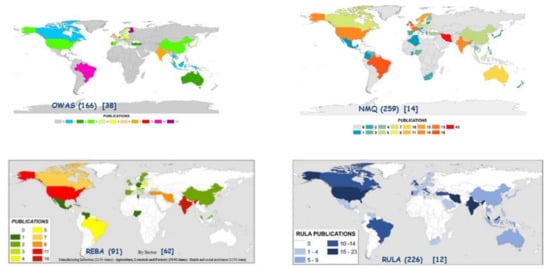Their use and impact worldwide have been studied in several of these studies [12,14,38,62]. The most commonly used one has been the NMQ [14] on 259 occasions, followed by RULA [12] at 226, OWAS [38] at 166 and REBA [62] at 91 (Figure 3). One can observe that their applications are practically the same on all continents except Africa. Of the South American countries, Brazil stands out. None of these assessment methods have been applied in the former Soviet Socialist Republics. In Europe, their application is widespread, as is the case in North America, South Asia and Australia.