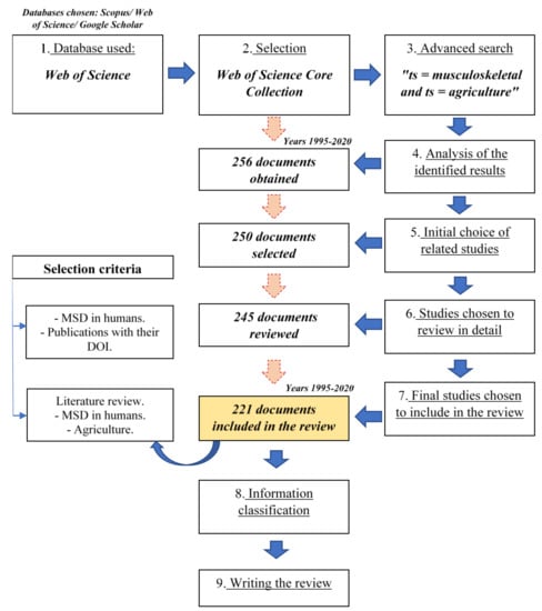 Finally, another selection criterion was applied: studies related to MSD in humans and agriculture. In this manner, 221 documents (included in this study) were finally selected, corresponding to the years 1995–2020. Finally, the information was classified according to different criteria.