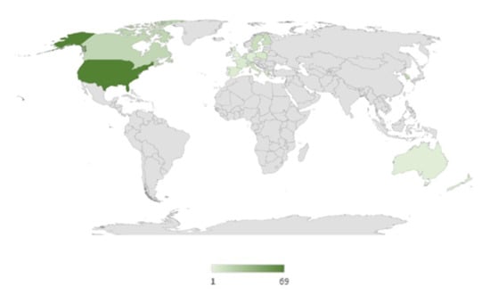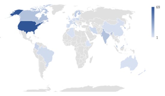 The figure shows in a general manner the countries in which the prevention of musculoskeletal disorders has become important in world agriculture from 1995 to 2020. The countries represented in blue are those in which a study has been carried out on this topic. If the blue color is darker, then it represents a greater number of studies in that country, the maximum frequency being 69 as observed in the legend. It can be observed that there are still many places where this problem is not considered.