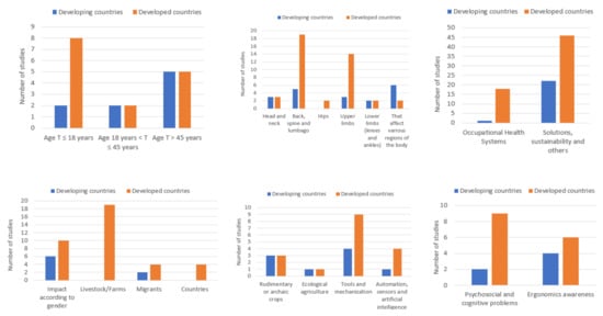 The number of studies carried out in developed countries is higher in almost all the fields used for classification. Only in six of these countries (age 18 years < T ≤ 45 years and age T > 45 years; head and neck, lower extremities (knees and ankles), rudimentary or traditional cultivation and organic farming) performed the same number of research studies existing in developing countries (Figure 10).