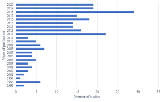 As indicated, the studies included in this research were published between 1995 and 2020. The largest number of studies (29) was published in 2018. This is followed by 2012, with a total of 22 studies.
