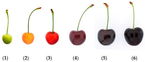 Based on our preliminary study [], five phenological stages (2–6) were analyzed: véraison (yellow stage), bright red (UC color chart 3.0; hue = 10–12°), mahogany (UC color chart 3.5; hue = 7–9°) or commercial harvest, dark mahogany (UC color chart 4.0; hue = 3–6°) and black or overripe (UC color chart 5.0; hue = 2°) (Figure 1). The fruit were assessed to guarantee commercial quality parameters were met following standard protocol for fruit analyses described by Param and Zoffoli (2016) (data not shown) []. Sweet cherries were stored up to 6 days at 0 °C enclosed in a bag (≈100 units per bag) under saturated condition to prevent desiccation and transferred to room temperature (20 ± 1 °C) at least 2 h before the sensory and volatile analyses.