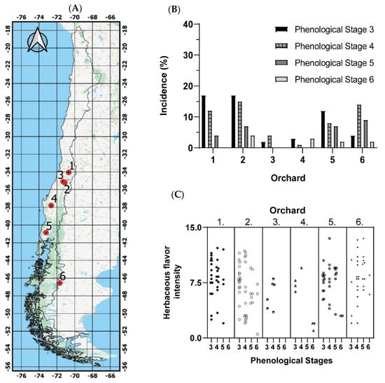 Herbaceous flavor incidence and intensity during fruit development of sweet cherry cv. Regina in orchards 1 to 6 during the 2019/2020 season. (A) Geographical distribution of the studied sweet cherry orchards in Chile. (B) Herbaceous flavor incidence per orchard. (C) Perceived intensity of the herbaceous flavor.