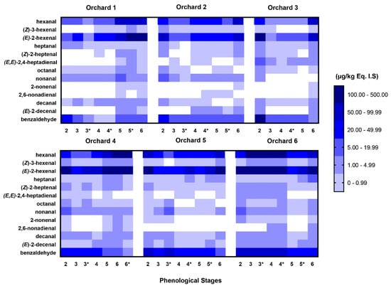 Volatile aldehydes concentration in pulped Regina sweet cherries during development in orchards 1 to 6. 3*, 4*, 5* and 6* indicate samples with the herbaceous flavor. White cells mean absent or not detected.