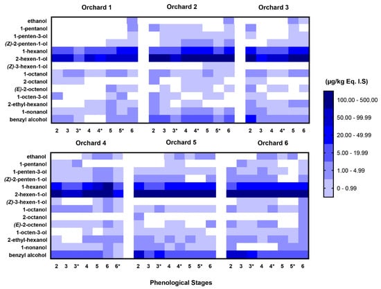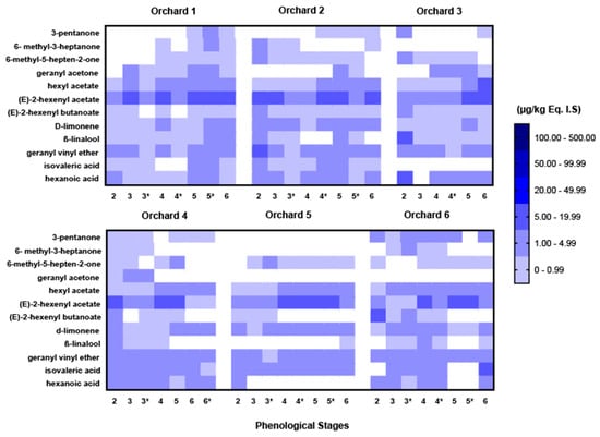 The semi-quantification of the volatile data from the six evaluated orchards, located in several locations across Chile, are shown as heatmaps in Figure 3, Figure 4 and Figure 5 and Supplementary Materials Table S1.