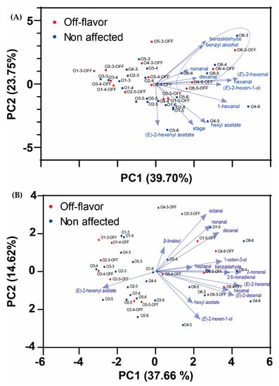 PCA of sweet cherry cv. Regina harvested from six orchards at four phenological stages: (A) volatiles with the highest concentration, and (B) volatiles with OAVs greater than 0.5. The points are labeled by orchard number (O1 to O6) followed by a hyphen and the phenological stage number (3 to 6), also, the tag ‘OFF’ was added for samples affected with off-flavor.