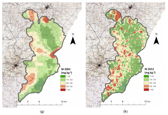 | Ni (mg kg−1) | 2002 | n.a. | n.a. | 620 | 1.80 | X: 7350 | 0.007 | 675 | 4.10 | 1295 | 1.62 | T (2581): −0.942 | 0.346 | |