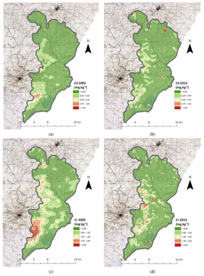 From the beginning of this study in 2002 to 2012, we registered an overall edaphic decrease of 49% (p < 0.01) in the average concentrations of available Cr (Table 1a). This overall decrease was registered in both the background values (MAI; p < 0.01) and reference values (HAI), for which the maximum concentrations decreased by 16% (Table 1a). The analysis of Table 1b reveals that there were no significant differences between the MAI values of Fluvisols, Luvisols, or Cambisols (p > 0.05), with only Calcisols presenting a statistically significantly greater concentration of the element (p < 0.01; test performed by pairwise comparisons). The HAI values were very similar between RSGs, for which the Calcisols also presented the higher concentrations (Figure 2b). From the observation of Table 1c, we can deduce that there are no statistically significant differences between the concentrations of this metal in the soils subjected to a rainfed or an irrigated agricultural system (p > 0.05). An analysis of the mean concentrations by reference soil groups (Table 1d; Figure 2b) also revealed that, when rainfed and irrigated systems were compared, there were no significant differences in any of the RSGs (p > 0.05) and that the element concentration was higher in Calcisols and lower in Fluvisols and Cambisols (p < 0.01; test performed by pairwise comparisons). From the predictive maps (Figure 3c,d), it was confirmed that it is in the west of the study area where the available Cr content is higher. From Figure 3c,d, it was confirmed that in the rainfed and irrigated areas to the west of the study area, the available Cr content is increasing with time, and the concentrations are higher than those of the irrigated land in the east.