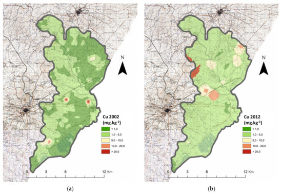 During the study timespan, the average available Cu content increased significantly by 123% (Table 2a; p < 0.01). This overall increase was registered in both the background values (MAI; p < 0.01) and reference values (HAI), for which they increased by 62% and 179%, respectively. A more detailed analysis revealed that there were significant statistical differences between the background values of Fluvisols and Calcisols and between those of Calcisols and Cambisols (Table 2b; p <0.05; test performed by pairwise comparisons), with no differences between the remaining pairs of soils (p > 0.05). It can also be deduced that the available Cu reference values by RSG were well below the concentrations allowed in Portuguese soils (50.0–200 mg kg−1), which can be confirmed in Figure 4a. A comparison of the mean Cu contents between the rainfed and irrigated cropping systems for the entire study area (Table 2c) revealed that the concentrations were similar for both cropping systems (p > 0.05), but when the analysis was carried out by RSG (Table 2d), there are significant differences between the contents of the element in rainfed and irrigated areas, with the concentrations of available Cu 82.7%, 76.9%, and 133% higher in irrigated than in rainfed Fluvisols, Calcisols, and Cambisols, respectively, all with p < 0.01. In Luvisols, the concentrations for both cultivation systems remained constant (p > 0.05). A study on the evolution of the element from 2002 to 2012 by cultivation system revealed that in the irrigation system, the average values increased by 184% (i.e., the average Cu content increased from 1.04 (N = 675) to 2.95 (N = 783, U test: 98,542,000, p = 0.000) mg.kg−1 from 2002 to 2012), while in the rainfed system, they remained stable (i.e., 1.09 (N = 620) to 1.68 (N = 513, T-test (1131): −6.872, p = 0.197) mg.kg−1 from 2002 to 2012). Figure 5a,b confirms that the increase in available Cu concentrations in the study area was generalized.