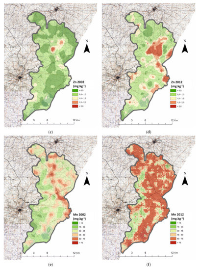 Identically to what we registered for Cu, the overall average concentrations of available Zn (Table 2a) increased by 64% (p < 0.01) from the beginning of this study. This overall increase was registered in both the MAI (p < 0.01) and HAI values, for which the concentrations increased by 42% and 86%, respectively. The analysis of Table 1b reveals that there were no significant differences between the MAI Zn concentrations in all RSGs (p > 0.05; test performed by pairwise comparisons) and that the HAI values were low and very similar, which can be confirmed in the Figure 4b and the observation of Table 2c, from which we may deduce that there were no significant differences between the concentrations of this metal in the soils subjected to a rainfed or an irrigated agricultural system (p > 0.05). An analysis of the mean concentrations by reference soil groups (Table 1d; Figure 2b) also revealed that, when rainfed and irrigated systems are compared, there are no significant differences in any of the RSG (p > 0.05). From the predictive maps (Figure 5c,d), it was confirmed that the increase in the average zinc content of the soils in the study area is generalized, being slightly higher in the older irrigated areas.