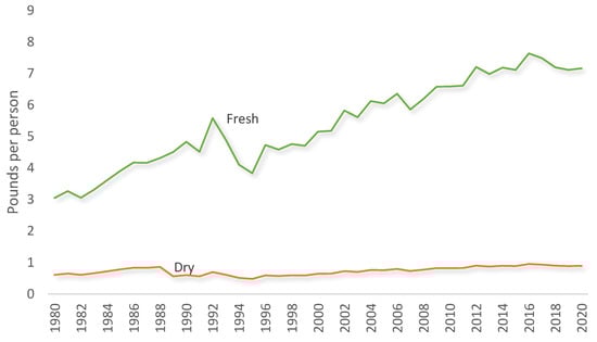 Per capita chile pepper consumption, 1980–2020. Source: USDA-ERS [9].