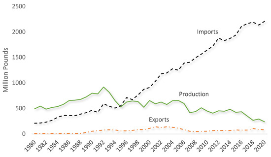 Per capita consumption of fresh chile peppers has increased from just over three pounds per person in 1980 to more than seven pounds per person in 2020 (Figure 2). While per-capita consumption has increased significantly over the last 40 years (135%), the majority of the increased demand has been satisfied by imports. Figure 3 shows that over the same 1980–2020 period, domestic chile pepper production declined more than 50% (nearly 75% from its peak in 1992) while imports increased by more than 950% [9].