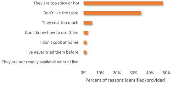 Survey participants who indicated they did not eat spicy peppers in any form were asked to identify why they did not. Seven possible reasons were provided to participants in addition to an opportunity to provide additional reasons. Participants were allowed to identify more than one reason if desired. The 38 participants who indicated that they did not consume spicy peppers in the last three months provided 122 reasons. The most common reasons provided (from the seven provided) by participants for not consuming spicy peppers were that they were “too spicy or hot” and they did not like the taste (Figure 4). Several of the “Other” additional reasons offered by participants were associated with digestive issues caused by spicy peppers.