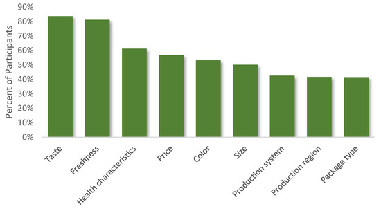 Survey participants were asked about the importance of nine characteristics of spicy peppers in their decision to purchase (price, production region, packaging, and production system, e.g., organic/traditional) and consume (taste, freshness, color, size, and health characteristics) the products. The percentage of participants indicating that an individual characteristic was important or very important to their decision to purchase or consume peppers ranged from 84% to 42% (Figure 5). As might be expected, taste and freshness were rated high in terms of importance in the participant’s decision-making process. Almost two-thirds of participants (61.2%) rated understanding the health characteristics of spicy peppers third as either important or very important to the decision to consume spicy peppers. Price, a clear economic variable, was rated fourth.