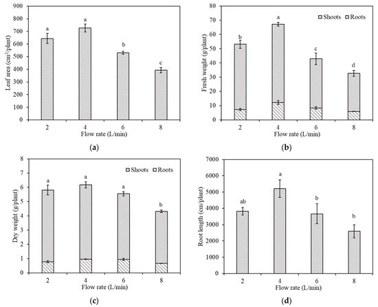 Growth parameters of the plants growth under different flow rates in this study. (a) Leaf area; (b) fresh weight; (c) dry weight; (d) root length. There were significant differences in the bars marked with different letters (p < 0.05). Data are expressed as means ± standard error (n = 4).