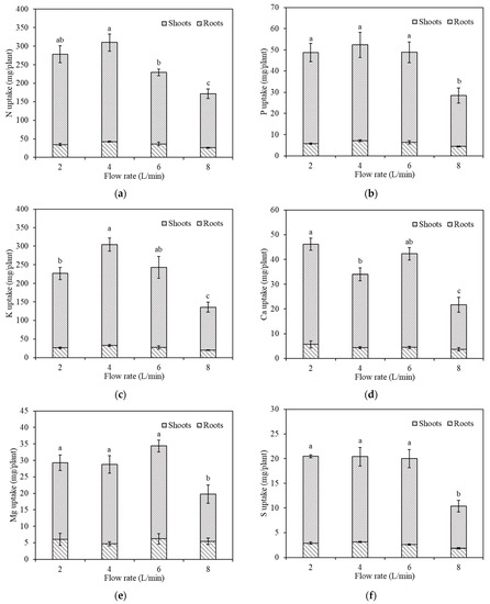 As can be seen from Figure 2f, with an increased flow rate from 2 to 6 L/min, the S uptake of the whole plant showed no significant difference, while it significantly decreased at the rate of 8 L/min as compared with other flow rates. The S uptake of plants cultivated under the flow rate of 8 L/min decreased by 48.2% in comparison to a flow rate of 6 L/min.