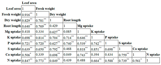 Correlations between plant growth and their nutrient uptakes are shown in Figure 3. There was a positive correlation between the growth parameters and nutrient uptake. Among them, the leaf area had a significantly positive correlation with plant fresh weight, dry weight, root length, and nutrient (N, P, K, Ca, and S) uptake. Root length had a strong positive correlation with plant fresh weight, leaf area, and nutrient (K and P) uptake. Fresh weight had a significantly positive correlation with nutrient (N, P, K and S) uptake, and dry weight was significantly correlated with all nutrient absorption, especially with N uptake (Pearson’s correlation coefficient: 0.849).
