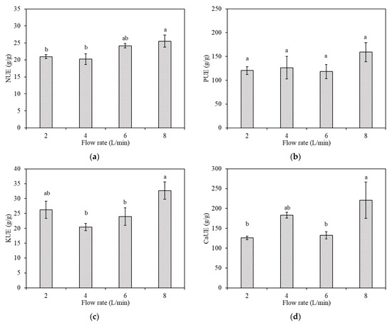 Figure 4b,e, show that the phosphorus use efficiency (PUE) and magnesium use efficiency (MgUE) did not significantly differ among the flow rates.