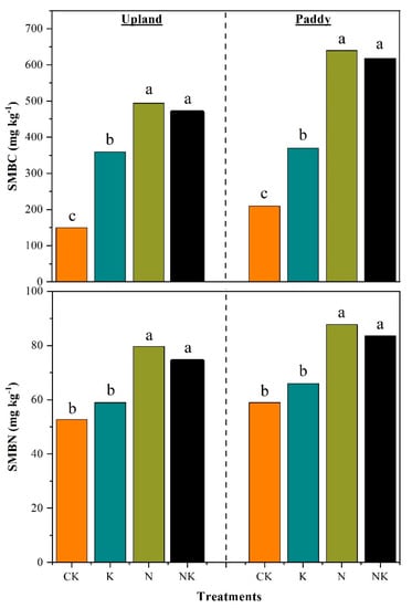 Soil microbial biomass C and N (SMBC, SMBN) concentrations under different fertilization treatments in upland and paddy soils. Notes: CK, no fertilizer; K, synthetic potassium; N, synthetic nitrogen and NK, synthetic nitrogen and potassium. Bars indicate the standard error, n = 3. Different letters indicate significantly different means at p < 0.05 using the least significance difference (LSD) test.