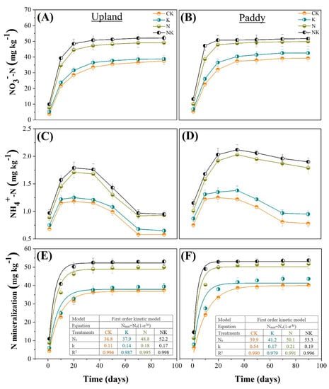 The incubation duration and the fertilization considerably influenced soil NO3−-N, NH4+-N contents and the net N mineralization in both paddy and upland soils (Figure 3). A significant effect was observed, demonstrating the variable concentration of NO3−-N and NH4+-N. A linear increase was observed in the NO3−-N concentrations during incubation; however, a more obvious increase was observed among all treatments after 20 days, and the maximum was observed in the NK treatment in both the soils (Figure 3A,B). NH4+-N concentration at first increased up to day 20 and then decreased but was relatively stable after day 70 of incubation (Figure 3C,D). Overall, after the 90 days of incubation, NO3−-N and NH4+-N contents under paddy soil were increased by 5.29%, 10.5%, 3.25% and 1.33% in CK, K, N and NK treatments, respectively, compared with the upland soil. The significant difference in the initial 20 days and the relatively stable mineralized N values at later stages reflected that the labile-N fraction and the intermediate fraction of applied N led to a wide-ranging k and N mineralization among both the soils with different fertilization.
