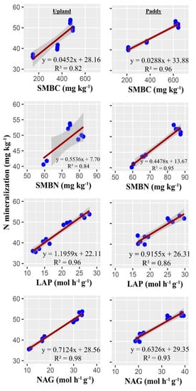 Relationship between net N mineralization and SMBC, SMBN, LAP and NAG under long-term upland and paddy experiment. The shaded area indicates the range at 95% confidence intervals. Permutation p values less than 0.05 and 0.01 were considered significantly different at p < 0.05 and p < 0.01.