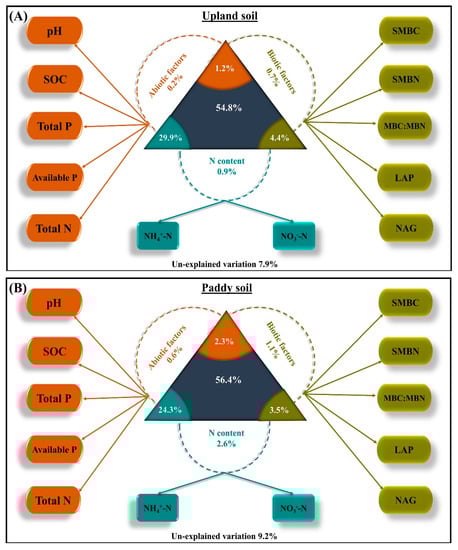 Venn diagrams showing the proportional contributions based on results from variation partitioning analysis (VPA), explaining the contribution of biotic factors, abiotic factors and N content to the net N mineralization in upland (A) and paddy soils (B). The effect of biotic factors (brown circle); the effect of abiotic factors (red circle); the effect of soil N content (blue circle); and their combined effects and respective variations explained are in areas overlapped by the different colored circles.