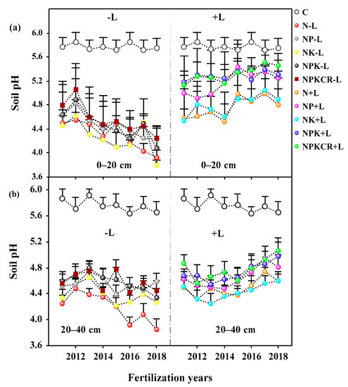 The differences between the soil pH values in the control treatment and other fertilizer treatments were generally much larger in −L, and smaller in +L; irrespective of the depth, the soil samples were taken (Figure 2). Compared with −L, the +L increased the average soil pH values of all fertilizer treatments by 3.0–22.6% in 0–20 cm and 4.2–11.9% in 20–40 cm from 2011 to 2018. This indicates that the dynamic changes in soil pH values between fertilizer treatments under −L and +L were relatively larger in the 0–20 cm depth than those in 20–40 cm depth.