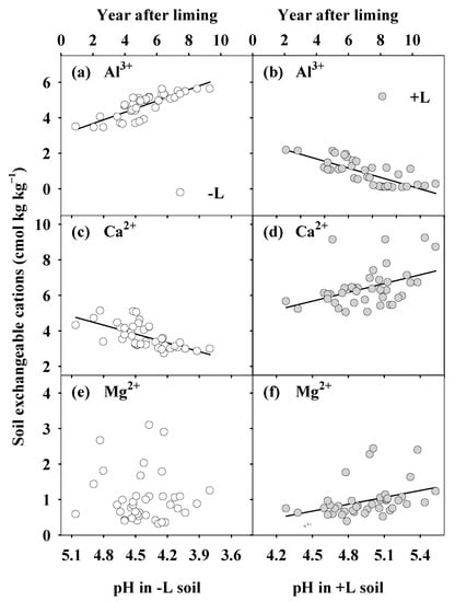 (a) Relationship between soil pH and soil exchangeable Al3+ in −L (Al3+ −L = −2 × pH + 14.10, r2 = 0.67); (b) in +L (Al3+ +L = −1.95 × pH + 10.54, r2 = 0.57); (c) soil exchangeable Ca2+ in −L (Ca2+ −L = 1.66 × pH − 3.66, r2 = 0.39); (d) in +L (Ca2+ +L = 1.65 × pH − 1.74, r2 = 0.16); (e) soil exchangeable Mg2+ in −L (Mg2+ −L = ns); and (f) in +L (Mg2+ +L = 0.64 × pH − 2.23, r2 = 0.11). The soil sampling depth was 0–20 cm with ns denoting p > 0.05. −L: without lime application, +L: with lime application.