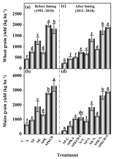 (a) Average annual wheat; and (b) maize grain yields, before liming; (c) annual wheat; and (d) maize grain yields, after liming, under various fertilization treatments of a field experiment in a wheat-maize rotation. Bars represent SD of means (n = 4). Bars with different letters indicate a significant difference at p ≤ 0.05 by the LSD test. C: no fertilizer application or control, N: nitrogen, NP: N and phosphorus (P), NK: N and potassium (K), NPK: N, P, and K, NPKCR: NPK plus crop residue (CR), −L: without lime application, +L: with lime application.