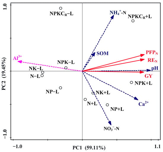 Moreover, the relationship between soil pH, exchangeable soil cations (Al3+, Ca2+ and Mg2+), and years after L were quantified by the linear regression equation. A redundancy analysis (RDA) was performed to evaluate the correlation between soil chemical properties (NO3−-N, NH4+-N, pH, SOM Ca2+ and Al3+) and GY, REN and PEFN using CANOCO for Windows (version 5) in the long-term liming and fertilization.