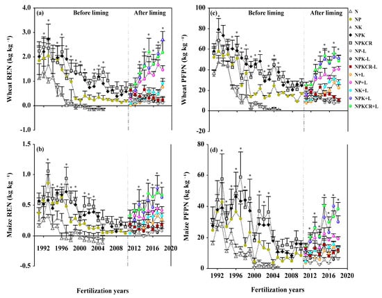 The NUE indices (REN and PFPN) of both wheat and maize under all fertilizer treatments exhibited similar patterns throughout the study periods, i.e., they generally showed a decreasing trend over 1991–2010 (before L), and 2011–2018 in −L, while showing an increasing trend in +L (Figure 6a–c). Further, the data showed that the variation in REN and PFPN of wheat and maize differed significantly (p ≤ 0.05) vis-à-vis L, fertilization years, and fertilizer treatments. Before L, the REN and PFPN of both crops decreased significantly after the first few years and then reduced slightly under all treatments. In addition, N-based fertilization −L decreased both the REN and PFPN of wheat and maize during 2011–2018, while it exhibited a steady increase in REN and PFPN when amended with L, in spite of some fluctuations in some years. NPKCR, NPK, and NP showed an apparent superiority over N and NK fertilizers in improving crop NUE, irrespective of L and fertilization years for both crops. Meanwhile, our data showed that no REN and PFPN were detected from P-omitted (N and NK) treatments during 2011–2018 in −L.