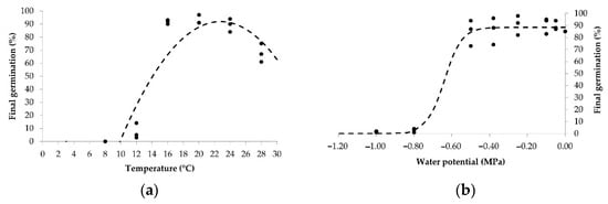 A parabolic model was used to describe the effect of temperature, while a logistic model was used to describe the effect of water potential. Tb and Ψb were estimated using cumulative germination data, which were presented as germination dynamics. The effect of the temperature and water potential on germination dynamics, expressed in days (t10, t50, and t90), was analyzed using means of variance analysis (ANOVA). After a significant F-test, the LSD test for p = 0.05 was used to compare the mean values. The germination dynamics curve was generated using the logistic function in the Bioassay97 statistical program [27] to determine the initial (t10), medium (t50), and final (t90) germination times. A linear regression, estimated using the bootstrap method [28], provided the best fit of germination rate (reciprocal of time to 50% germination) against incubation temperature or water potential. The values of Tb and Ψb were estimated as the intercept of the regression line with the temperature or water potential axis [7,22,29].
