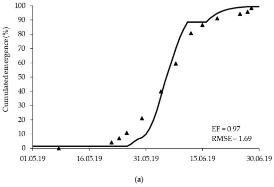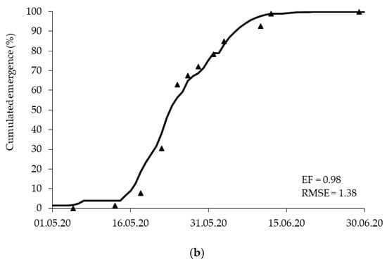 As dominant weed species in a natural seedbank in a Croatian field [18], E. crus-galli was present in high density in Sasinovecki Lug. The average densities were 933 and 834 plants/m2 in 2019 and 2020, respectively, which highlight the reliability of the model stimulation. Indeed, a prediction of E. crus-galli emergence by AlertInf in Veneto was performed by a much lower weed density (56.6 plants/m2) [30]. Model simulation of E. cus-galli emergence in maize at Sasinovecki Lug is shown in Figure 4a,b for 2019 and 2020, respectively. The AlertInf model fit the observed data satisfactorily, with EF indices of 0.97 and 0.98 in 2019 and 2020, respectively. However, the emergence data show that the model underestimated the onset of emergence in 2019 and overestimated it in 2020. In addition, a slight overestimation was observed in 2019 from the middle to the end of emergence. The RMSE is 1.69 and 1.38 in 2019 and 2020 respectively, which means that the average deviation predicted from measured values is small.