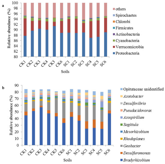 - Wang, C.Y.; Jiang, K.; Zhou, J.W.; Wu, B.D. Solidago canadensis invasion affects soil N-fixing bacterial communities in heterogeneous landscapes in urban ecosystems in East China. Sci. Total Environ. 2018, 631–632, 702–713. [Google Scholar] [CrossRef]