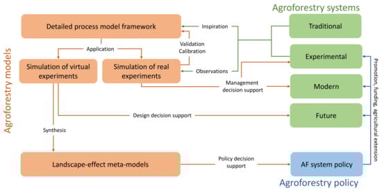 Especially for agroforestry systems, the contribution of system features, management and design, to NCPs is not fully understood []. Here, process-based models have great value for testing hypotheses, increasing system understanding, and informing on-field experimentation prior to establishment, through virtual experiments [,]. This is particularly relevant for agroforestry systems because of the long timeframes required for their establishment and their large number of designs. Once designed and parameterised, process-based models can create a space of possible agroforestry system responses to external variables, which can then be picked up by simpler models (emulators), meta-models, or form the basis of indicator systems for scaling to larger areas or over longer time spans, which is often required for policy support [,]. Figure 1 shows the conceptual relations and feedback between real agroforestry systems, agroforestry models and policymaking, highlighting the benefits of decision support by use of models.