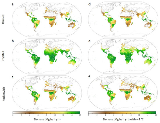 Spatially resolved projections of mean annual biomass production (Mg ha−1 y−1) of Agave americana over 5 years, simulated with current climate conditions (left, a–c) and with +4 °C warming (right, d–f) and in conditions with native rainfall inputs only (a,d), with irrigation applied to eliminate water limitation to growth (b,e), and with rock mulching and no irrigation (c,f). The rock mulch management was only simulated in locations with annual water input less than the optimum in panels c and f, but all potential land and biomass are shown on the map (inclusive of both lands without rock mulch and lands with the rock mulch that have water inputs lower that optimum) for comparison with the other simulations. Protected areas and urban areas were also removed from the area of simulation.