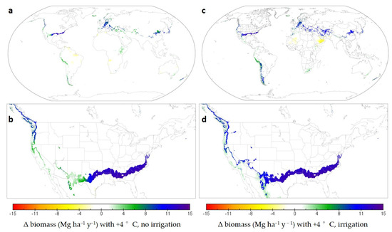 The climatically suitable growing region for A. americana is predicted to expand in climate warming scenarios by 2–4 million ha (Table 1; Figure 2a,c). Biomass yields increase with future climate change in most regions (Figure 1, right panels), with a total increase of 1–4 Gt depending on management (Table 1). Some decreases in biomass yields were projected in Brazil, Venezuela, Angola, Morocco, Algeria, Tunisia, and Australia due to increased temperatures combined with precipitation changes (Figure 2a). In the scenarios with irrigation applied, there were declines in projected future yields relative to current conditions in Mauritania, Mali, Algeria, Saudi Arabia, Yemen, and Oman. The largest climate-related increases in biomass production, in scenarios both with and without irrigation, were predicted at the margins of the current growing regions. Northerly expansion of the potential crop range was predicted with a warmer future (Figure 2a,c); this is evident in the United States (Figure 2b,d), Europe, and Asia where growth is currently limited by the extreme minimum temperatures. There were also biomass increases predicted in the Southern hemisphere, specifically in New Zealand and the Andes mountain range in South America (Figure 2a,c).