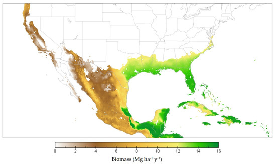 Projections of potential biomass yield (Mg ha−1 y−1) for Agave americana in North America with current climate conditions and no irrigation.