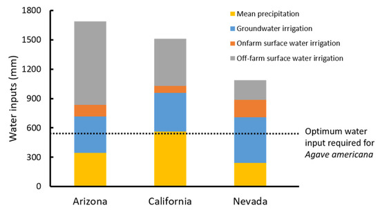 Water inputs from agricultural crops in three southwestern states. Mean precipitation (yellow) reflects the 30-year average [30]. Irrigation from groundwater (blue), onfarm surface water (orange), and off-farm surface water (gray) are distinguished (source: [29]). The dotted line indicates the water requirement required for water to be non-limiting for the growth of Agave americana.