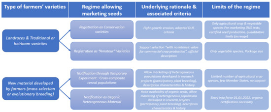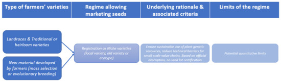 The rationale of the Swiss regime reaches farther compared to the EU’s focus on the static conservation of genetic resources and the amateur gardener segment, as the niche variety regime was designed “with the objective to enable the sustainable use of PGRFA and to reduce technical barriers for small-scale value chains” [51]. By acknowledging the internal genetic diversity of the populations that can be registered through the niche variety regime, it completely breaks with the UPOV-led paradigm of uniform plant varieties and recognizes one of the core characteristics of landraces or farmers’ varieties, their heterogeneity. The Swiss regime also explicitly recognizes the selection efforts that can be carried out in farmer seed systems, thereby allowing farmers to reclaim their role as innovators and breeders, beyond mere producers. It further offers farmers a wider, conscious and deliberate choice between homogeneous commercial varieties, and more diverse populations that are more adapted to local agroecological production [52], and can also be registered and commercialized by small-to-medium-scale farmer networks. The Swiss regime hence allows a single-entry point for different types of farmers’ varieties in a streamlined and straightforward regime (Figure 2).
