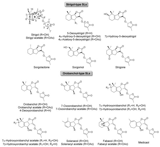 After the correction of the structure of orobanchol, SLs also began to be classified according to the stereochemistry of their C-ring, taking the strigol type as β orientation and the orobanchol type as α orientation (Figure 1 and Figure 2). It should be noted that this classification criterion is only valid for canonical SLs.