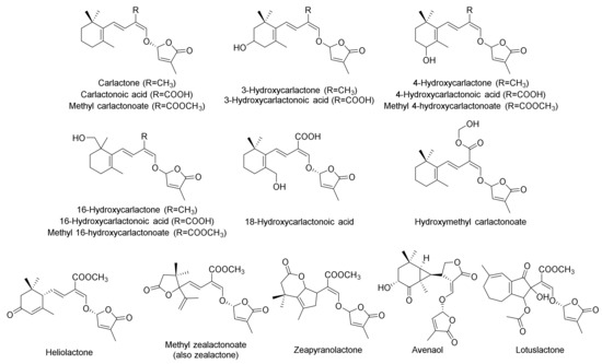 Strigol and strigyl acetate were the first SLs isolated from plant material, by Cook et al. (1966) [12] from cotton (Gossypium hirsutum) exudates, a non-host plant. Strigol at low concentrations proved to be actively eliciting the germination of some species of the parasitic weed genera Striga and Orobanche [6,12,13] which promoted the study of SLs for the development of new herbicides based on natural products.