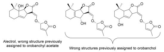 Special milestones were also the correction of the first structures suggested for orobanchyl acetate and orobanchol, being the C-ring stereochemistry, the most relevant point. They were wrongly defined due to the structural complexity of SLs, compounded by the small isolated amounts, low stability and, especially, for the limited technical means of the time on structural characterization. Orobanchyl acetate was wrongly defined as alectrol (Figure 3), being corrected 16 years after its first isolation [18]. Figure 3 also shows two previous wrong structures suggested for orobanchol, whose correction was detailed by Zwanenburg et al. (2016) [19]. Both corrections should be taken into account when reading articles about orobanchyl acetate and orobanchol, especially those prior to the establishment of their right structures in 2008 and 2011, respectively.