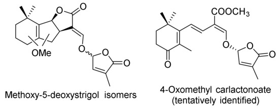 The complexity of characterizing new SLs continues to be a difficulty. An idea of this may be given by the not yet confirmed structures found together with 5-desoxystrigol in tobacco (Nicotiana tabacum), related by their discoverers to methoxy-5-deoxystrigol (Figure 4) [20,21]. Yoneyama et al. (2018), on the other hand, related them to the structure of 4-oxomethyl carlactonoate [22].
