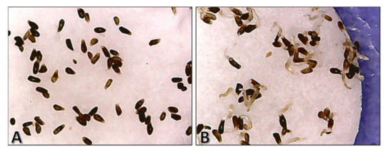 Photographs of Orobanche cumana seeds after a germination bioassay. (A) No germinated seeds, after treatment with an inactive compound; (B) almost all germinated seeds after treatment with a high-active compound.