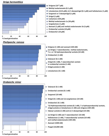 Among all the SLs, strigone can be considered an example of efficient agrochemical, since its treatment at low concentration (10−5 µM) can achieve the 100% of S. hermonthica germination [24]. Activity of solanacol and orobanchyl acetate may also be highlighted, since percentages over 95% were obtained for O. minor at 0.1 nM [71]. Both SLs also achieved around 80% for P. ramosa at 0.1 and 1 nM, respectively [25].