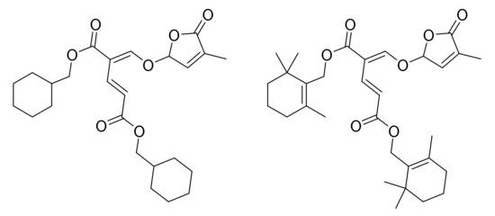 In the study of Mori et al. (2016) [91] two synthetic analogues structurally related to dimers of non-canonical SLs were also shown (Figure 7), and whose MEC values were 10 pg/disc. Other related compounds were presented in the same study, with MEC values of 100 or 1000 pg/disc, as well as three hydroxylated carlactone derivatives with much higher MEC values (10,000–1,000,000 pg/disc).