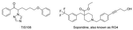 The treatment of crops with inhibitory compounds of the SL biosynthesis, which inhibit the production of SLs in the host plants, can provide an alternative tool. The result would be similar to that of intercropping: the parasitic seeds do not have the compounds that elicit their germination. In this respect, azole-type compounds have been studied, since they inhibit the oxidation of carlactone into canonical SLs (see Scheme 1). Particularly, the compound TIS108 (Figure 8) proved to reduce the production of SLs in both rice and tomato with no adverse effects on tillering or shoot branching, and, moreover, it reduced parasitism of O. minor and S. hermonthica (greenhouse pot test) [101]. This compound inhibited the formation of 4-deoxyorobanchol in rice in a dose-dependent manner in the range of 10−100 nM [102]. TIS108 can be likewise interesting in the suicidal germination context, since it stimulates rapidly the germination of high percentages of Phelipanche aegyptiaca seeds if the preconditioning period in water (common in germination bioassays) is not applied to the seeds [103]. On the other hand, compounds able to inhibit the SL receptors in weed seeds can be equally useful to control the parasitic pests. As an example, compound RG4 (also called soporidine, Figure 8) inhibits S. hermonthica germination at concentrations that are not phytotoxic to rice [104].