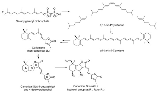 With regard to their biosynthesis, it should be noted that SLs derive from carotenoids, which derive from the condensation of two molecules of geranylgeranyl diphosphate (Scheme 1). The non-canonical SL named carlactone is the first intermediate containing a methyl furanone, and it has been suggested to be the biosynthetic precursor of canonical SLs [7]. Detailed descriptions of SLs biosynthesis can be consulted in recent reviews [8,9,10,11], where aspects that are still unknown in this area are highlighted.