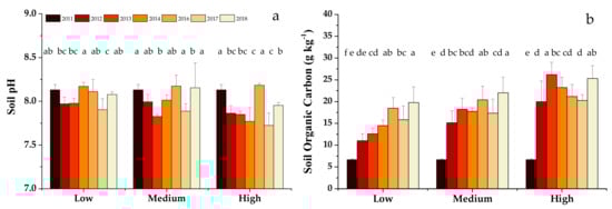 Soil pH (a) and organic carbon (b) of three treatments from 2011 to 2018. Different letters above the vertical bars indicate significant differences (p < 0.05).